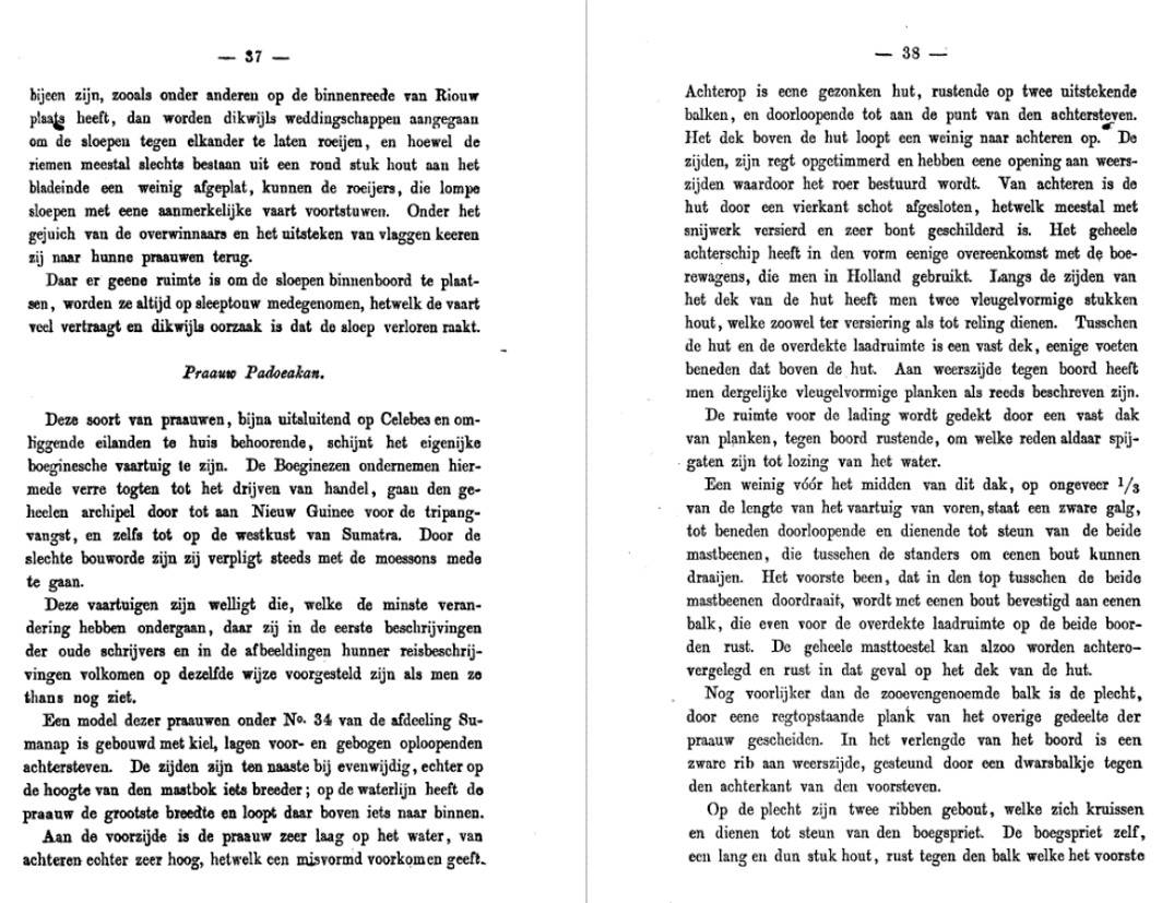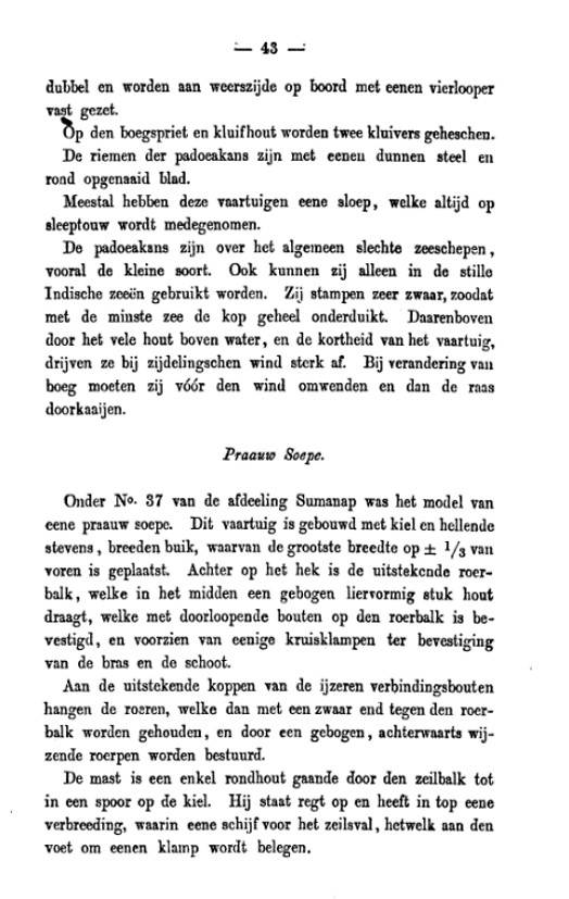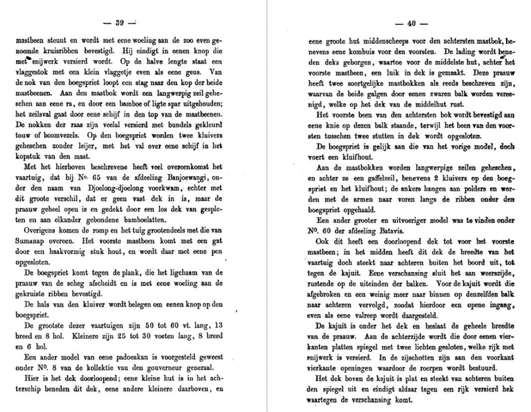 "[... Sebuah maket asal koleksi Gubernur Jenderal Hindia-Belanda] dibuat di atas sebatang lunas, linggi haluan yang rendah serta linggi buritan yang melengkung. [...] Bagian haluan perahu itu agak rendah dalam air, dan buritannya sangat tinggi [...]. Di dalam bagian buritan terdapat sebuah kamar, terletak di atas dua balok yang memanjang sampai ke linggi buritan. Geladak di atas kamar itu sedikit melandai ke atas pada bagian buritannya. [Pada] kiri-kanan sisinya [kamar itu ...] terbuka untuk beri akses ke kemudinya. [...] Di depan [kamar itu] terdapat sebatang balok melintang berat yang menjadi penopang tiang buritan [...].