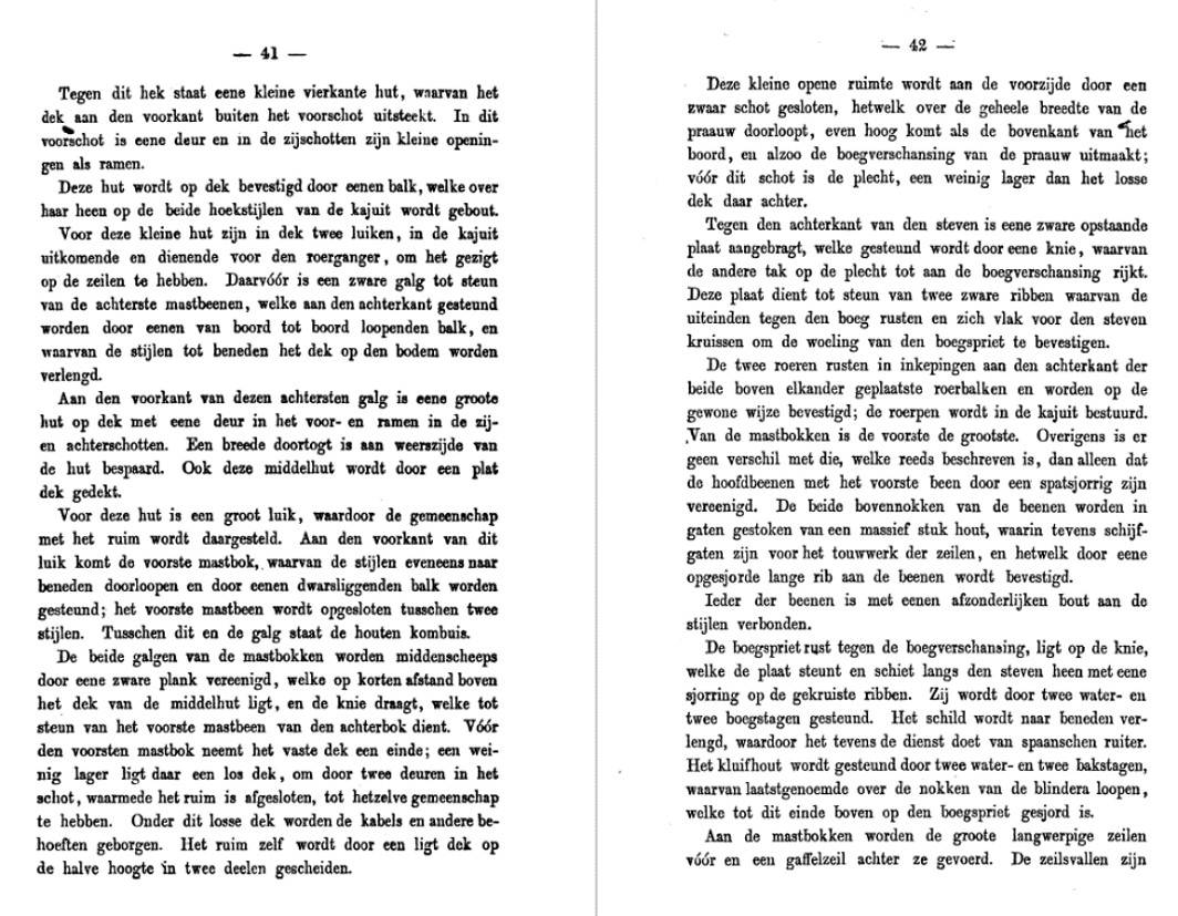 "Pada sisi depan kayu itu terletak sebuah kamar yang luas di atas geladak dengan selembar pintu di sekat depannya. Kiri-kanan dari atap kamar itu terdapat jalur lorong yang lebar. [...] Di depan kamar tengah itu ada lubang palka yang besar. Pada sisi depan palka itu terdapat balok-balok pemegang tiang utama [...]. Lebih ke arah haluan lagi terdapat dek haluan yang lebih rendah daripada geladak lain [...] yang ditutup ke bagian lambung lain dengan [sebuah sekat dari] papan yang berat."